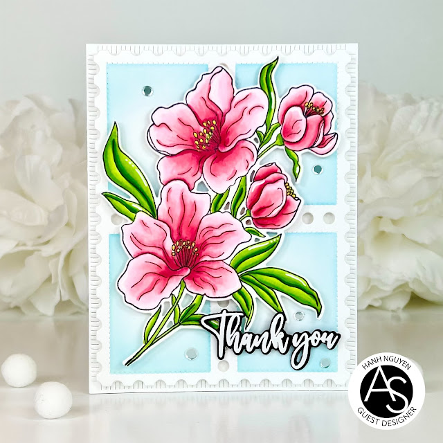 Thank You! I have a gorgeous floral postage stamp style thank you card to share with you today featuring this absolutely beautiful Grateful For You set. Not only is the image amazing but there is a variety of matching sentiments to choose from. I love that the matching die set also diecuts these sentiments.